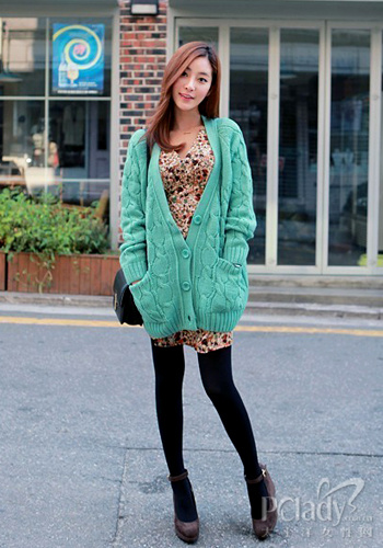 古著的毛衣是當(dāng)季的熱門必買單品,不需要過多的花樣設(shè)計(jì),只要顏色變化,哪怕整體都是黑色搭配也是絕對(duì)不會(huì)出錯(cuò)的,碎花的連衣裙和黑色褲襪形成鮮明對(duì)比,麻花編織粗線毛衣外套才是真正的主角