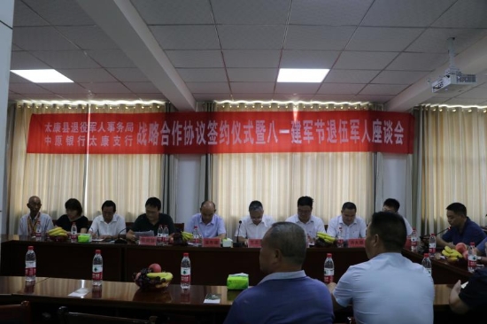 7月31日,太康縣退役軍人事務局與中原銀行太康支行舉行戰(zhàn)略合作協(xié)議簽約儀式,同時組織部分退役軍人召開了慶“八一”座談會?;顒佑赏艘圮娙耸聞站指本珠L張規(guī)劃主持。