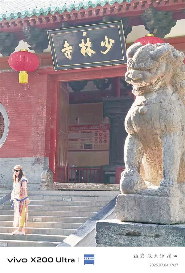 第三,構(gòu)圖的力量與視覺(jué)平衡:“并排而立”的張力結(jié)構(gòu)。其構(gòu)圖極具匠心,高大威猛的石獅占據(jù)畫(huà)面一側(cè),其“齜牙聳首”的姿態(tài)形成強(qiáng)大的視覺(jué)重量感,象征著少林寺深厚的歷史積淀與威嚴(yán)。與之并排而立的少女,雖體量較小,卻因其鮮亮的色彩和人物主體的身份,在畫(huà)面中形成了不容忽視的平衡力量。兩者之間形成的對(duì)角線(xiàn)張力,構(gòu)建了穩(wěn)固而富有動(dòng)感的畫(huà)面結(jié)構(gòu),引導(dǎo)觀者視線(xiàn)在歷史象征與當(dāng)下個(gè)體之間流轉(zhuǎn)。臺(tái)階的存在,自然地劃分了空間層次,強(qiáng)化了這種對(duì)話(huà)的空間感。
