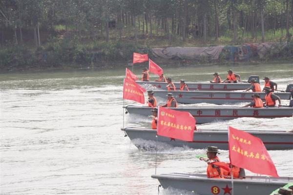 民兵操縱沖鋒舟進(jìn)行水上編隊演練。